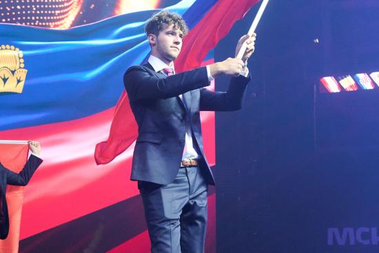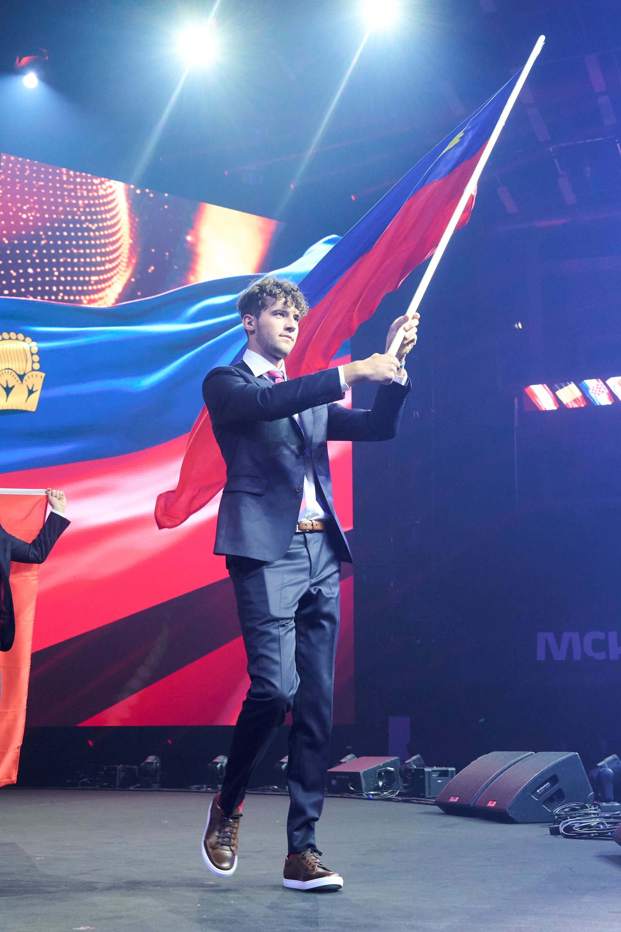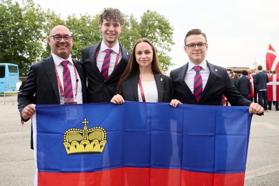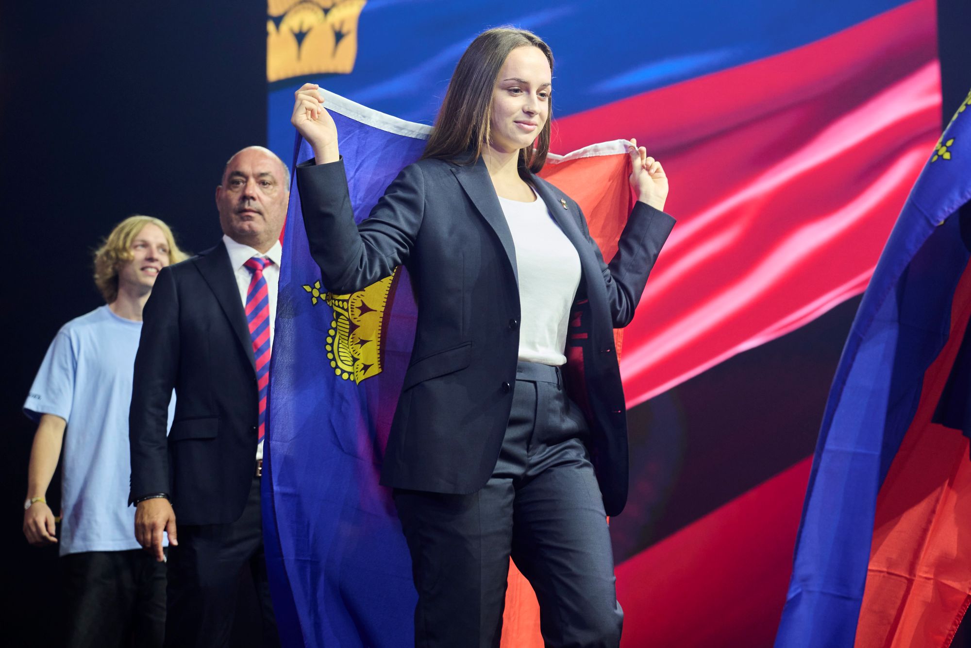 Fahnenträger Noah Oehry führte unsere Delegation stolz an, gefolgt von den Kandidaten Constantin Vogt und Hannah Oberparleiter, die gemeinsam ein starkes Zeichen für Liechtenstein setzten.